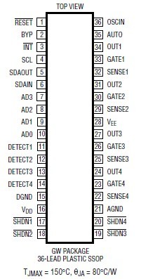 Features: (1)Controls Four Independent . 48V Powered Ethernet Ports; (2)Operates Autonomously or Controlled by I2CTM Serial Interface; (3)4-Bit Programmable Digital Address Allows Control of Up to 64 Ports; (4)Current and Duty Cycle Limits Protect External FETs; (5)IMPROVED UVLO; (6)Available in a 36-pin SSOP package.